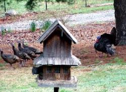 Photo of wild turkeys in yard behind bird feeder. The old feeder in the photo is several years old. When I first built it there were 3/8" perches, 3" long on every side, 4 sides. About 24 total perches. Now they are all worn off to only stubs! Many thousnads of tiny feet have worn them away over the years. it is now looking haggard and forlorn but I had a lady come buy a couple of years ago and try to buy it. I told her I could build her one like it but she insisted she wanted the old ...