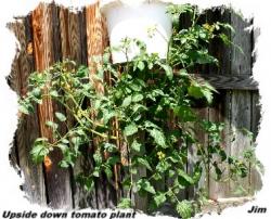 Has anyone ever planted a tomato plant upside down? Here is a photo of one I planted in a 2 1/2 gal bucket about a month ago. It is a "grape" tomato. Already covered with blooms and a few green tomatoes. Since then, I've planted another " patio" tomato plant and cucumber seeds in the top of the bucket. They also are coming along nicely. I think it will be interesting in another three or four weeks. A hanging compliment of veggies. It does require a lot of water.